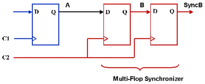 then the stage-1 signal is sampled by the same clock into a second stage flip-flop, with the intended goal that the stage-2 signal is now a stable and valid signal synchronized into the destination clock domain